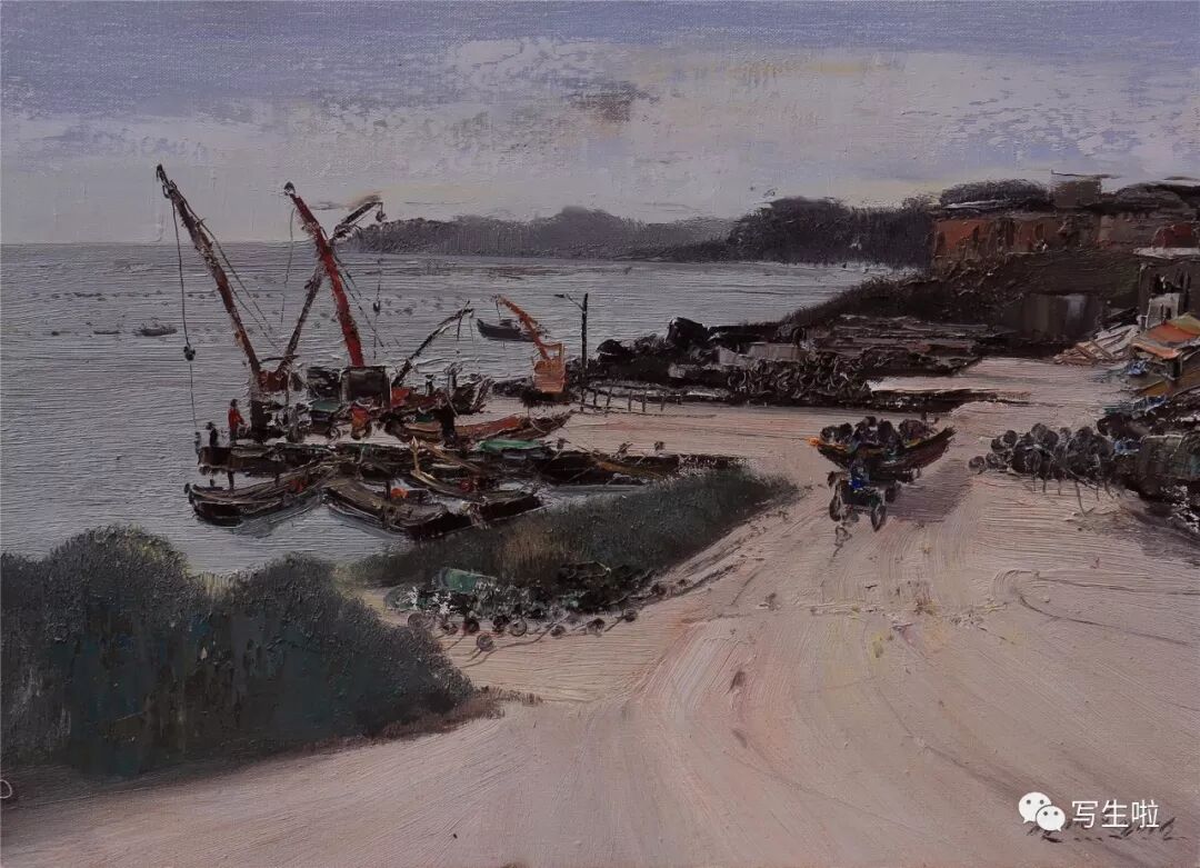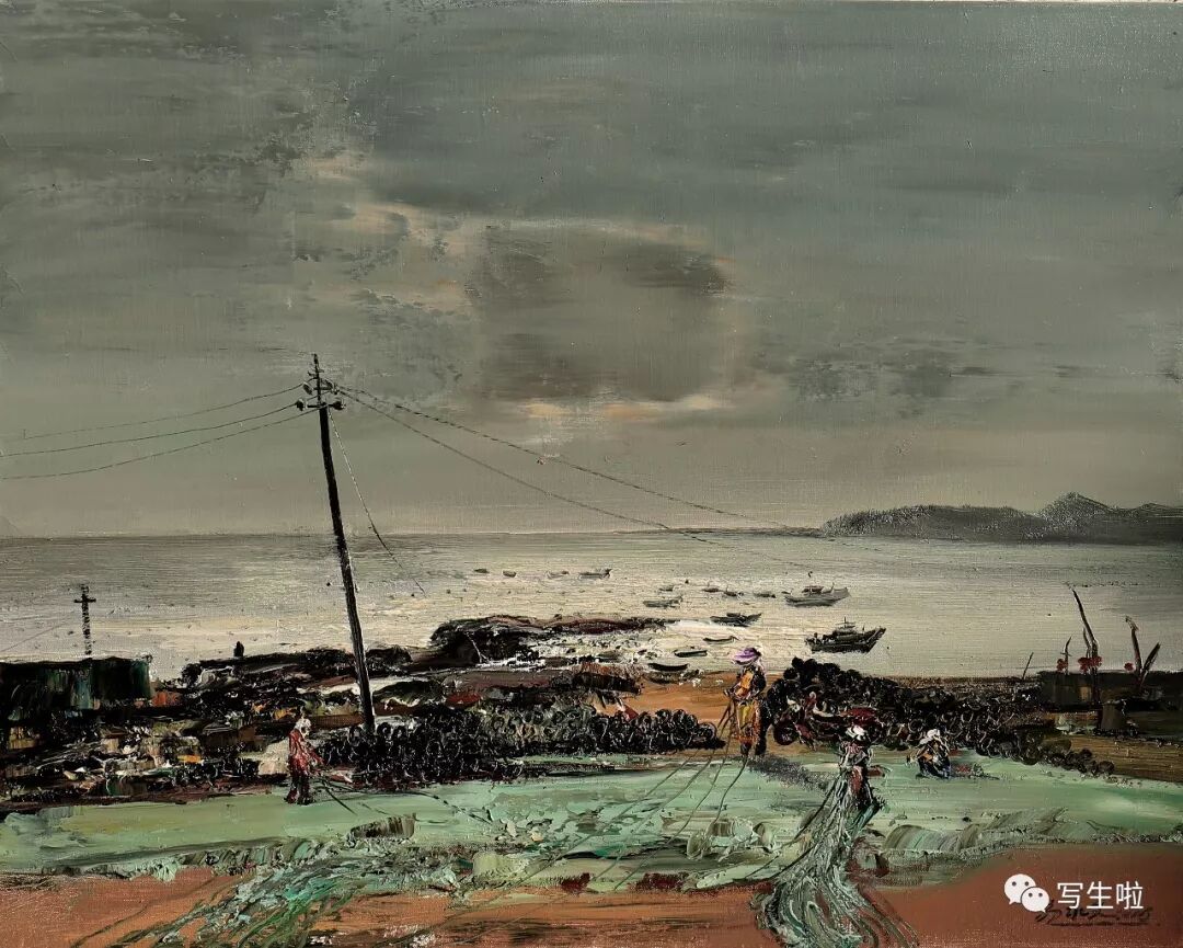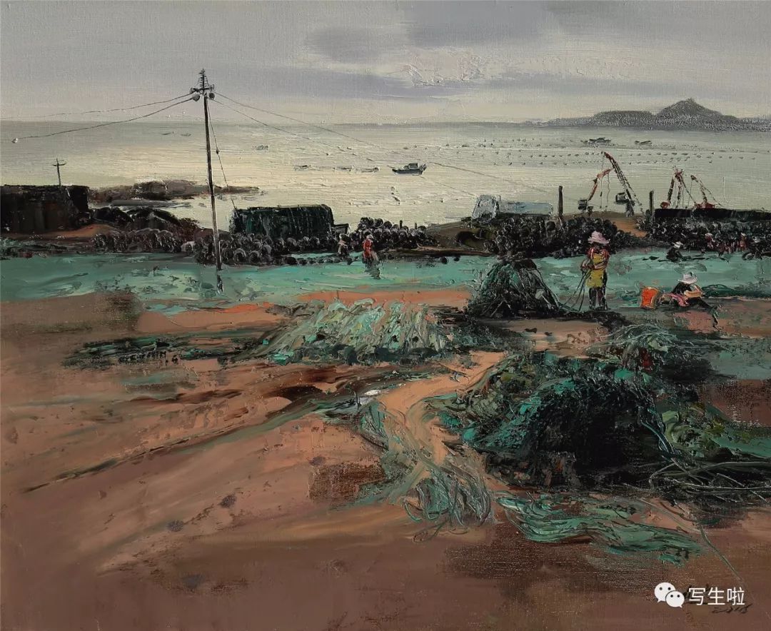 名家书画:郭永文 景物画《海滩的渔民》100x80cm
