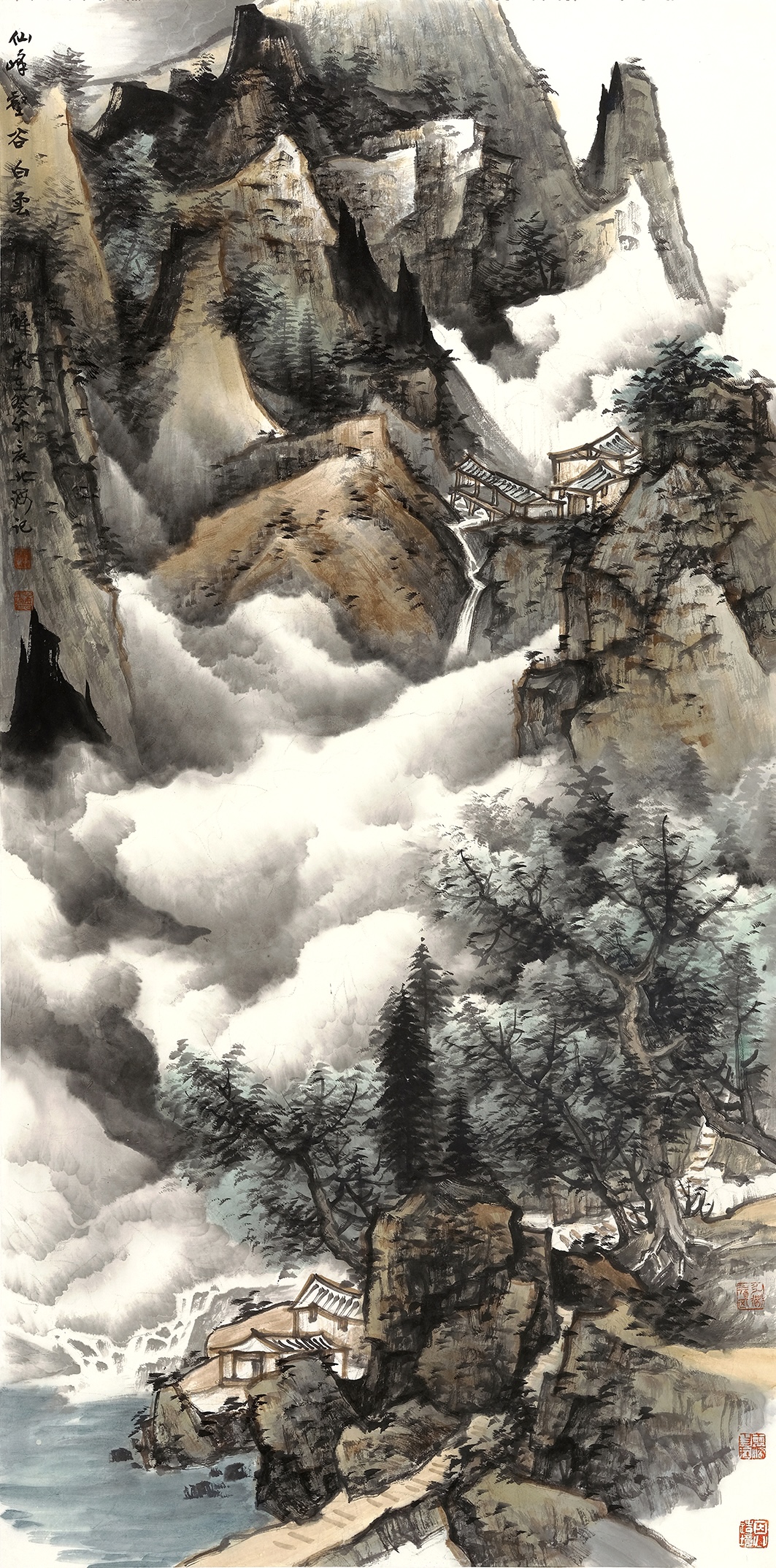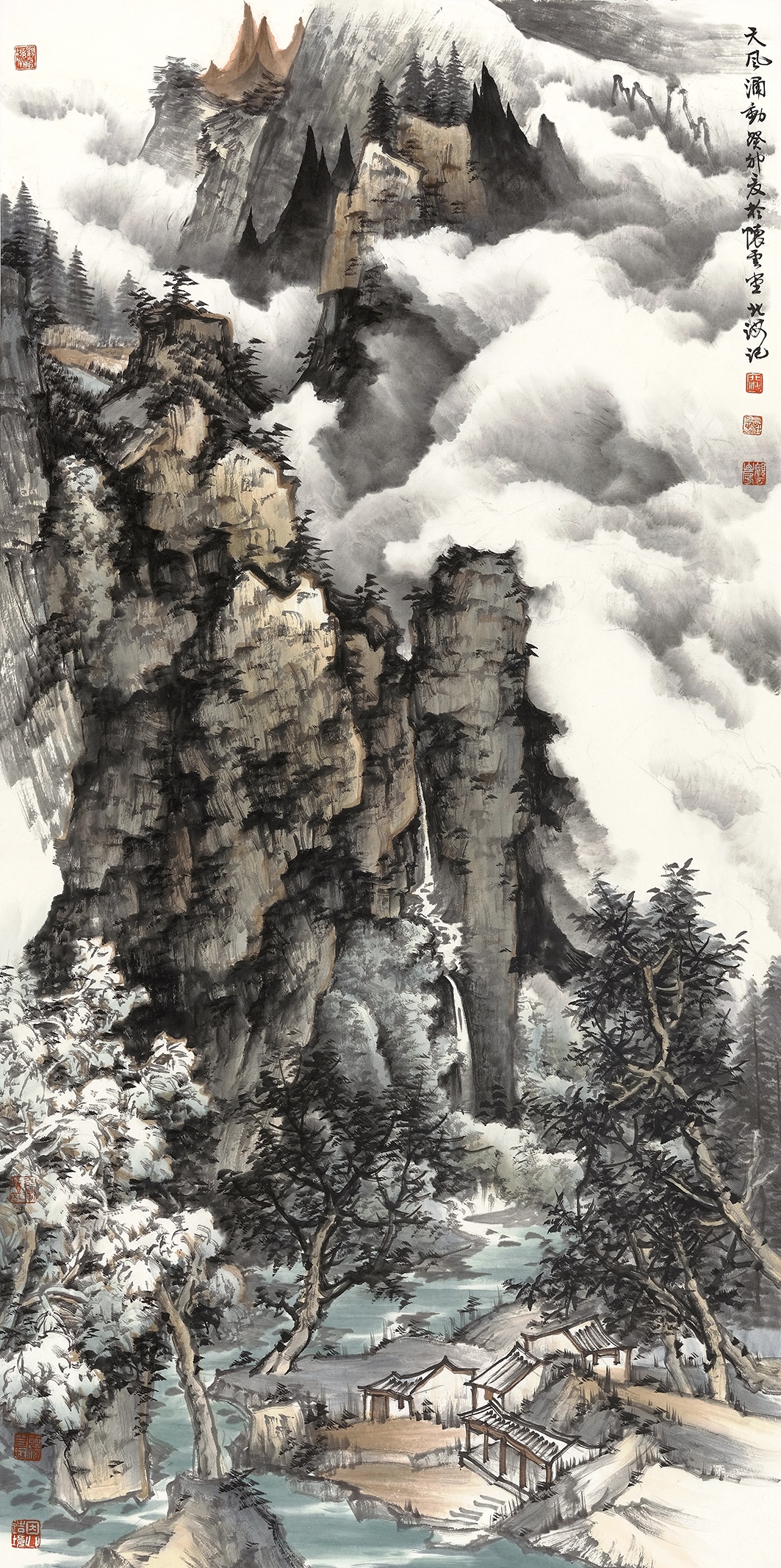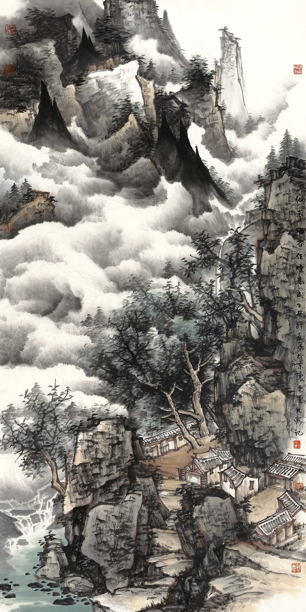 在山水画技法上,北海打破了“重山轻云”的传统图式和以“留白勾线渲染”为主的单一方法,创立了以积墨步云为核心的新形式风格与笔墨语言。他将云提升为画面构成的主体,刻画精微、别开生面,为山水画开拓出兼具文化内涵与时代精神魅力的审美新境,开创了“宋家云山”的新天地,为山水画领域谱写了新篇章。