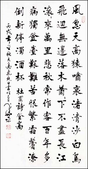 风急天高猿啸哀,渚清沙白鸟飞回。无边落木萧萧下,不尽长江滚滚来。
