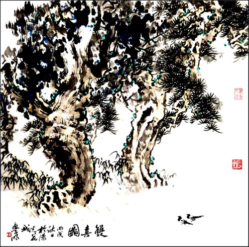 王学明 山水画《双喜图》 69x69cm