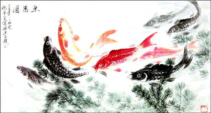 沈雪生 花鸟画《鱼乐图》48x89cm
