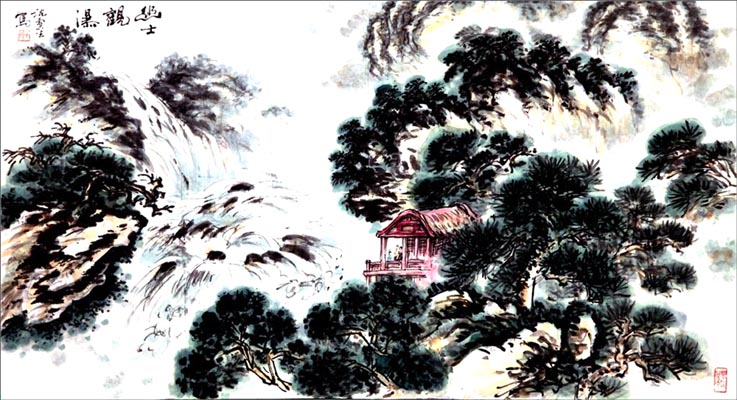 沈雪生 山水画《幽士观瀑》48.5x88.5cm