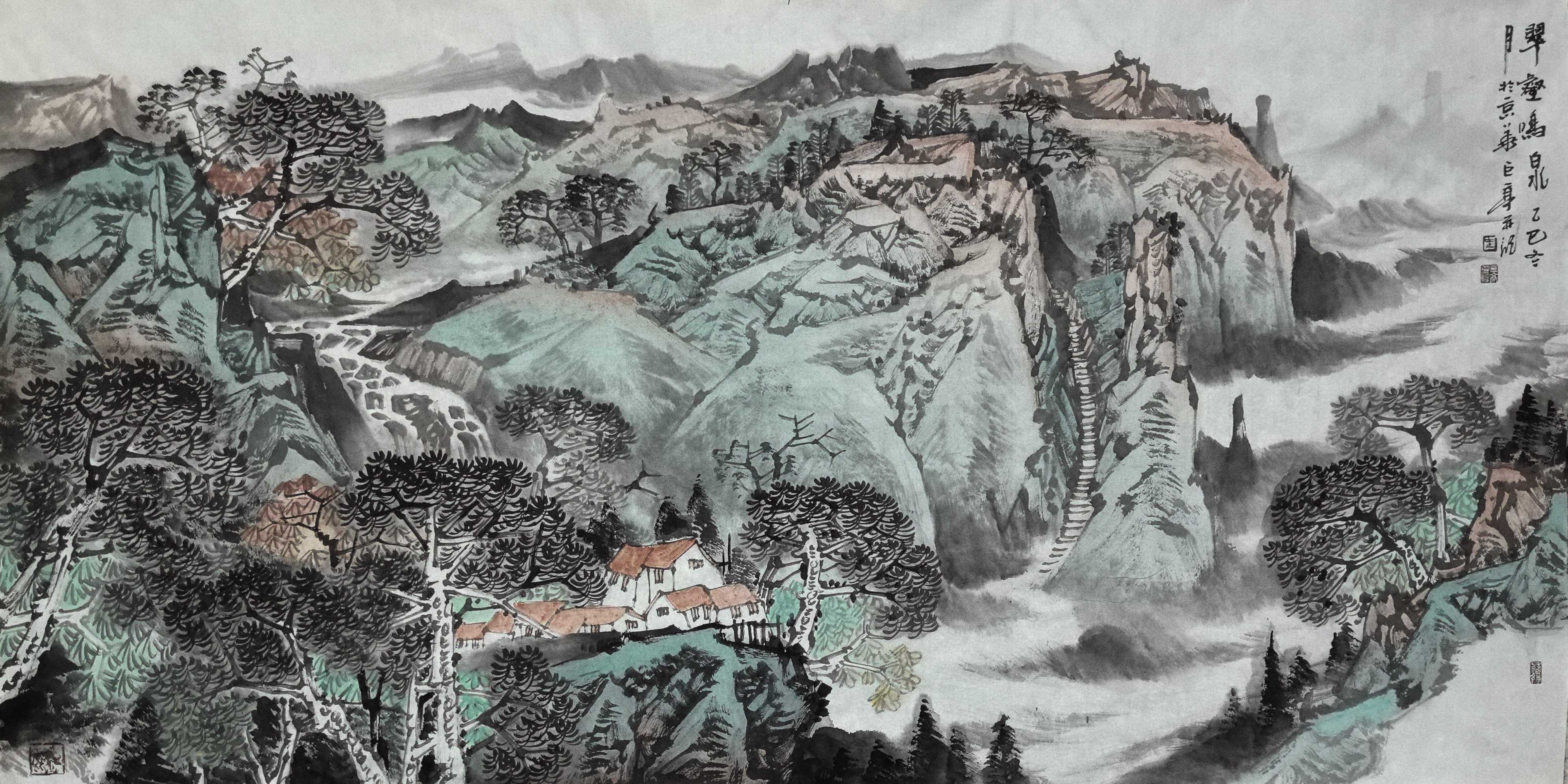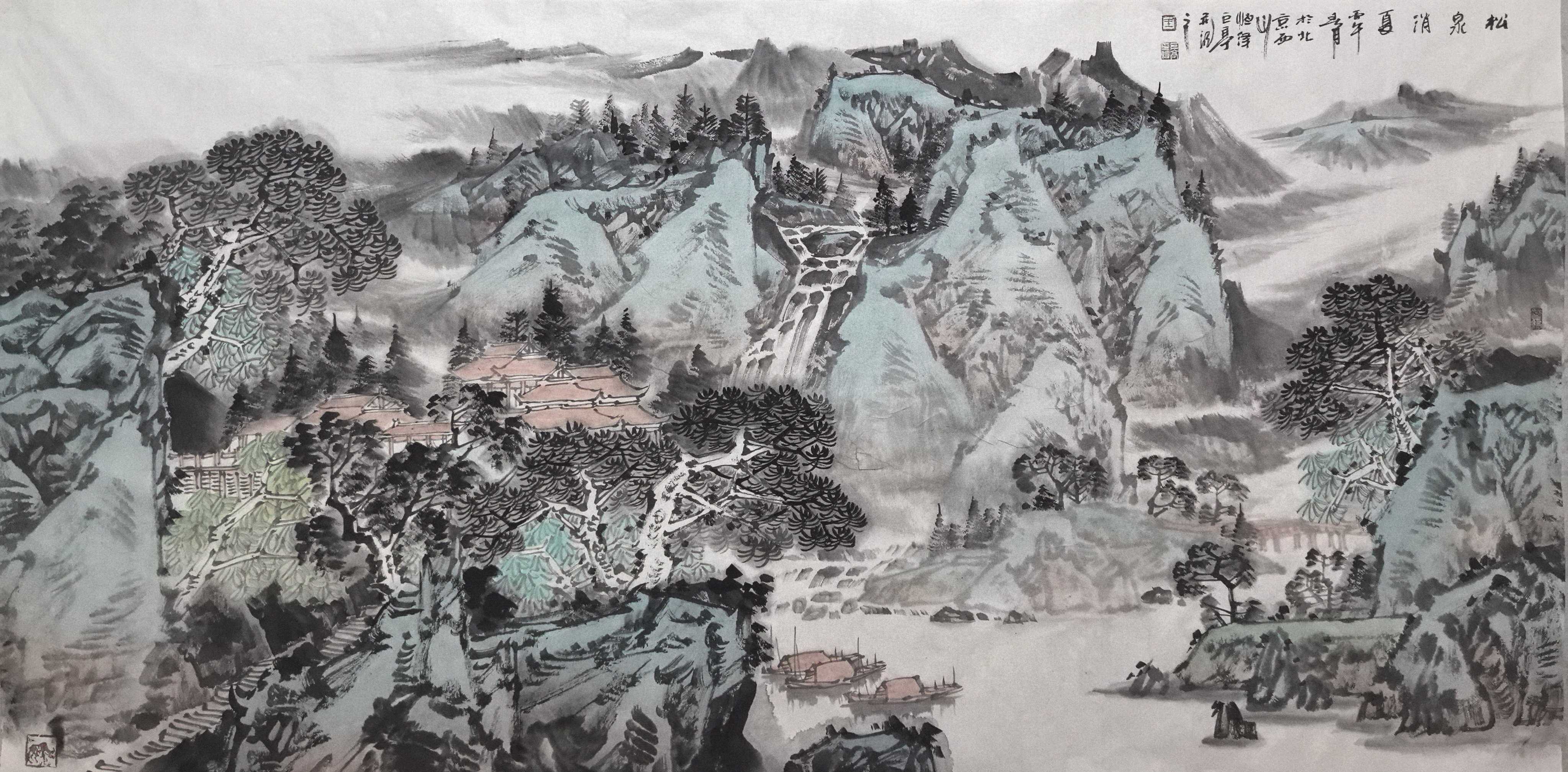 名家书画:王巨亭 人物画 《松后祥音图》 68x136cm