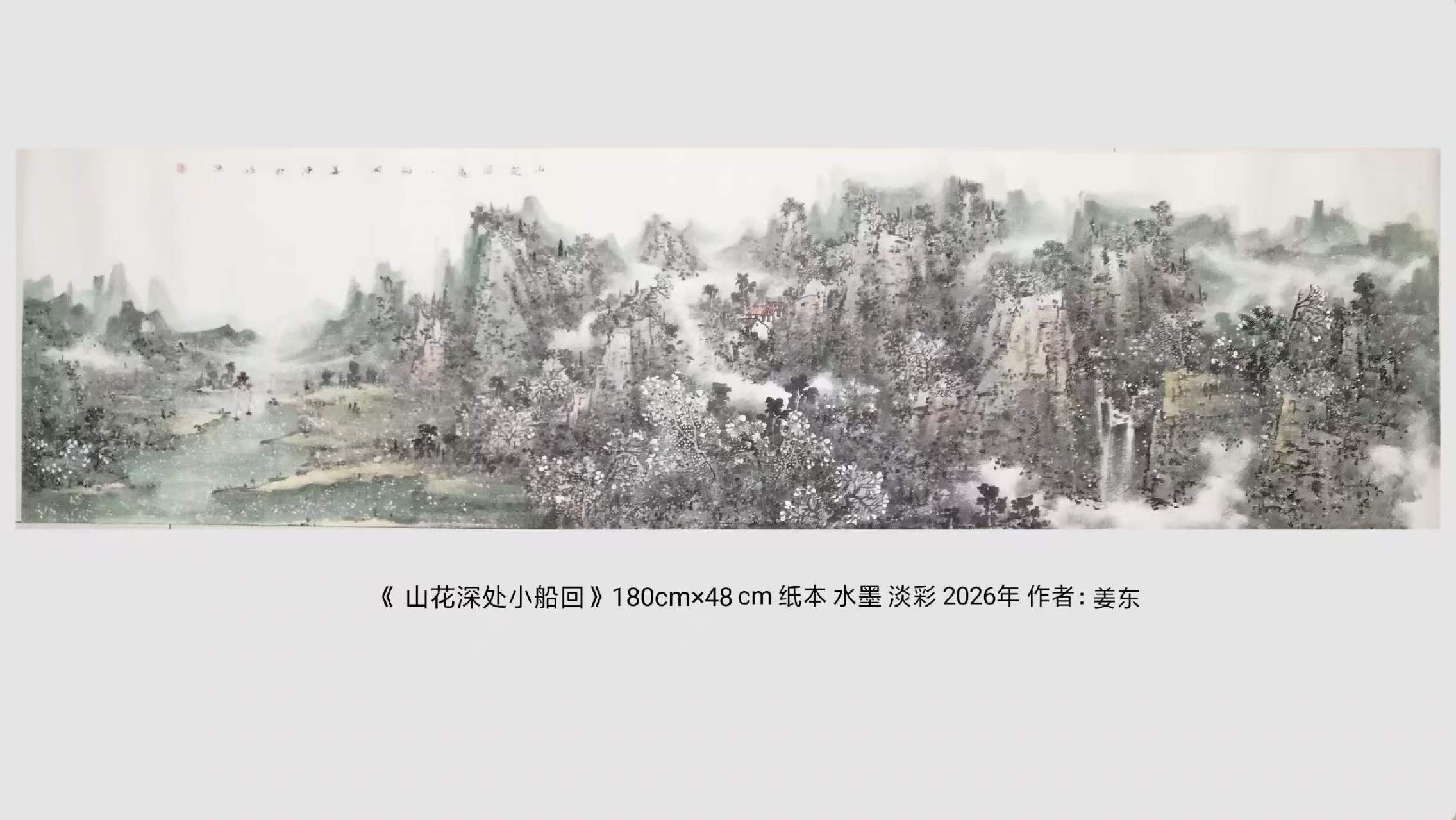 名家书画:姜东 山水画《山花深处小船回》180cmx48cm