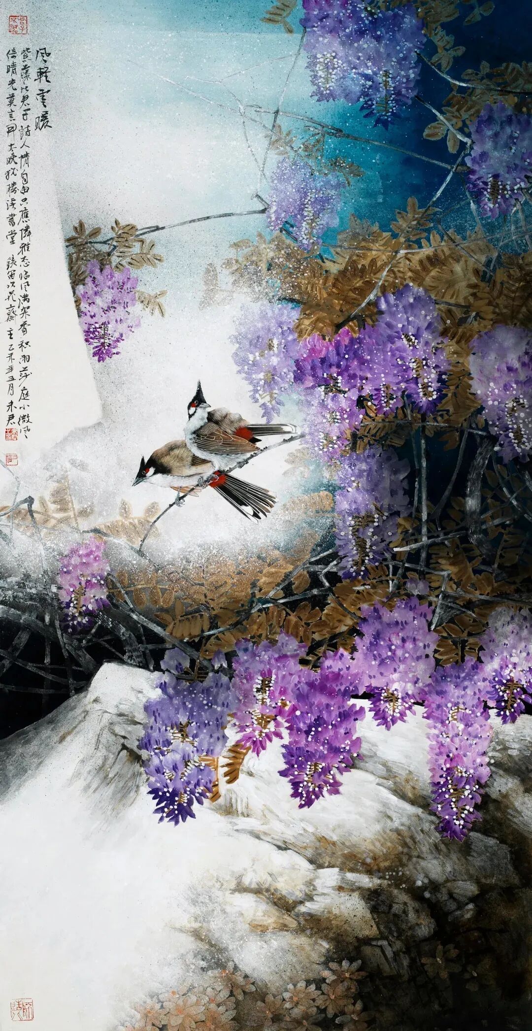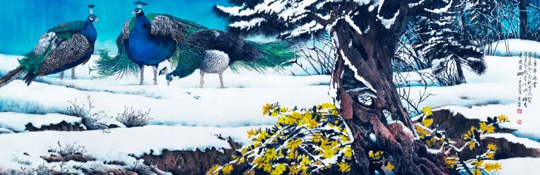 名家书画:未君 重彩花鸟画《雪霁初晴》63×190cm