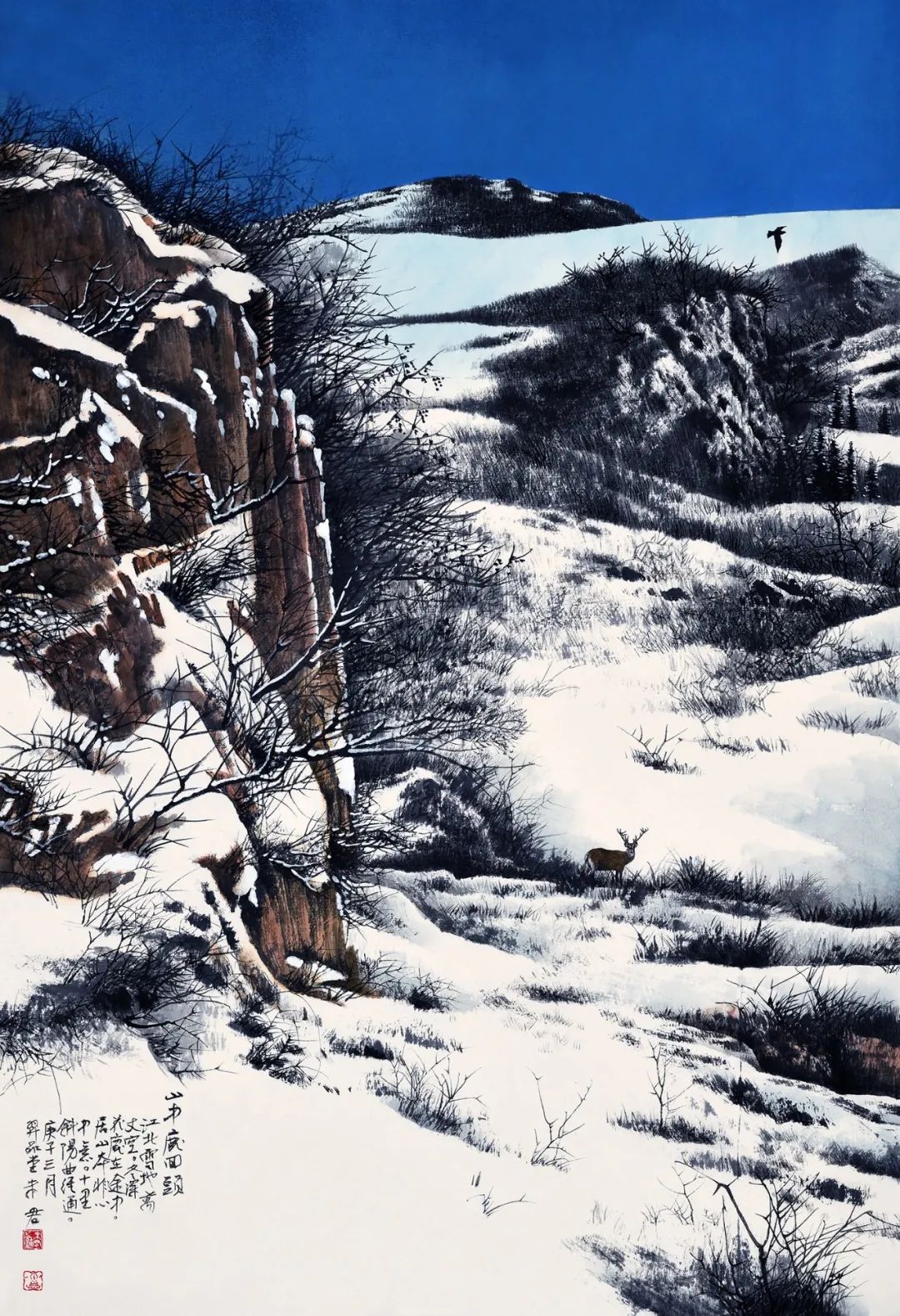 名家书画:未君 重彩山水画《苍山飞雪》103×70cm
