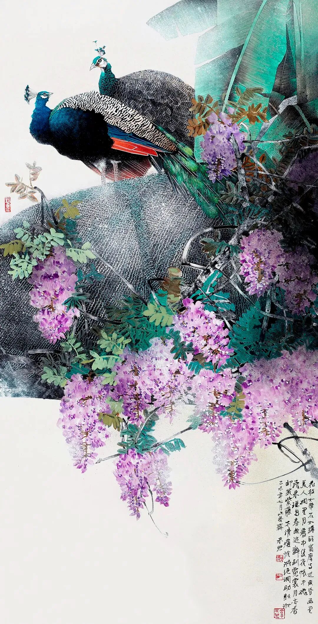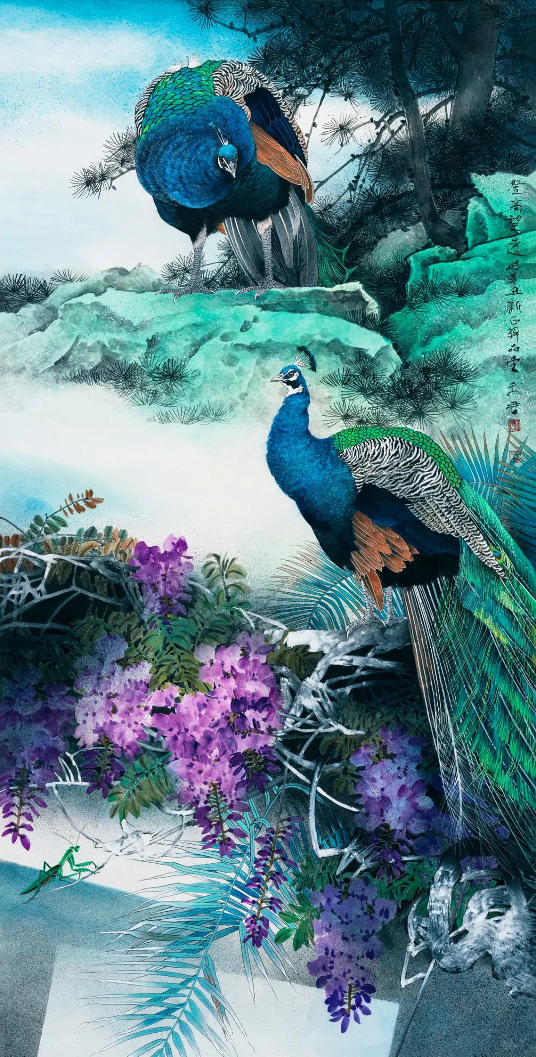 名家书画:未君 重彩花鸟画《登高望远》138×69cm