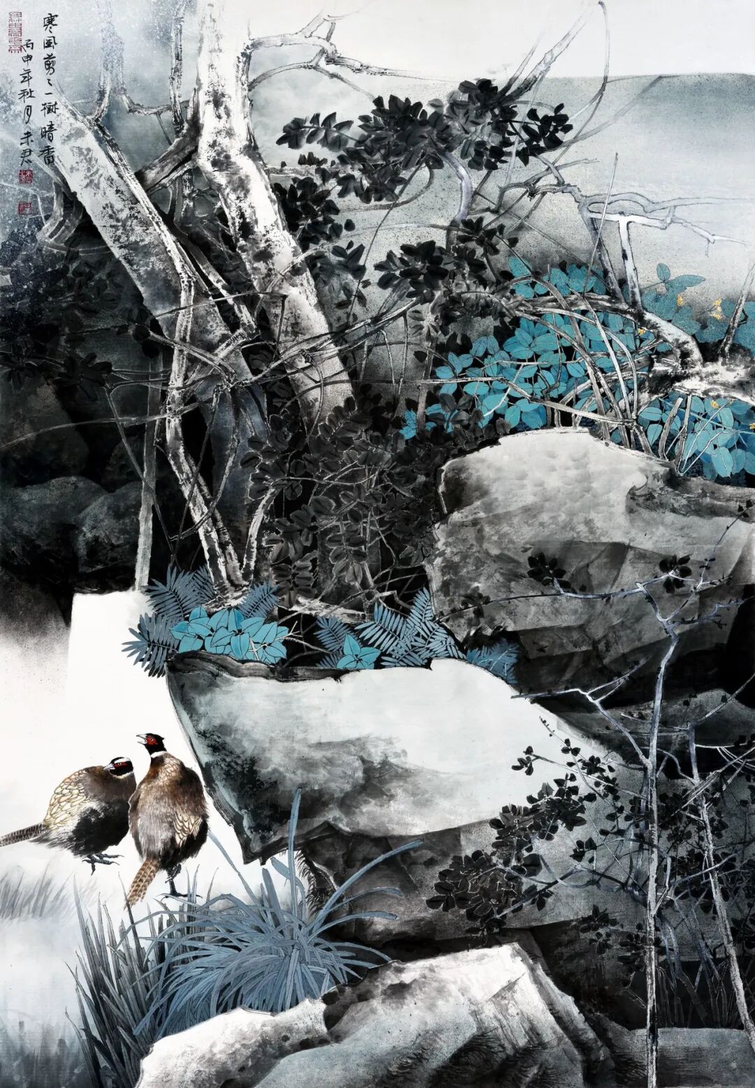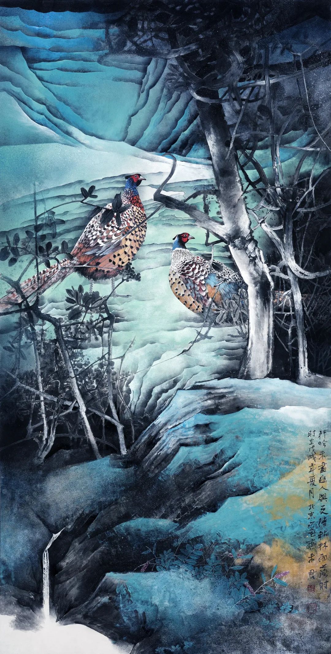 名家书画:未君 重彩花鸟画《疏林雨落》138×69cm