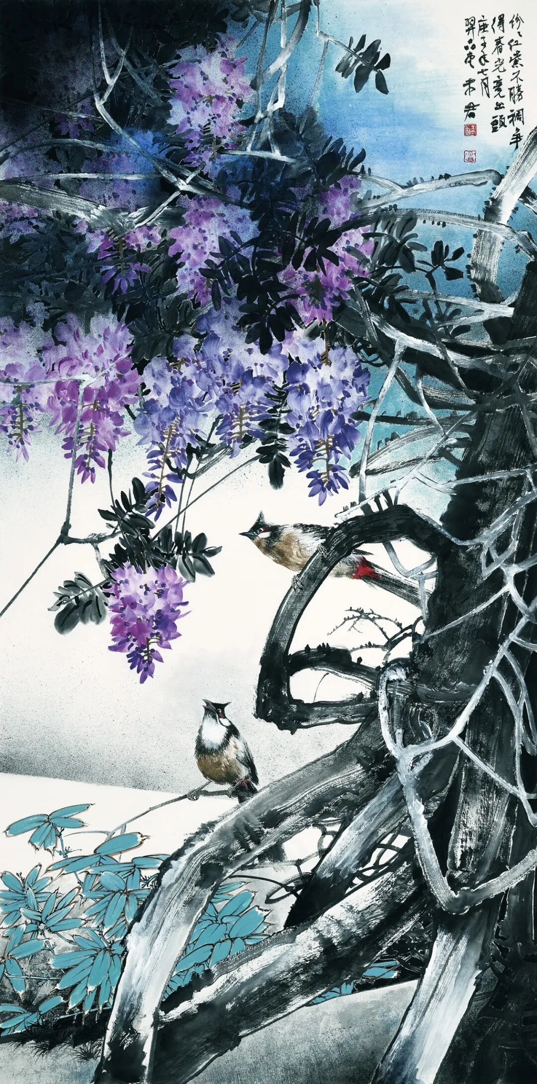 名家书画:未君 重彩花鸟画《闹春》165×62cm