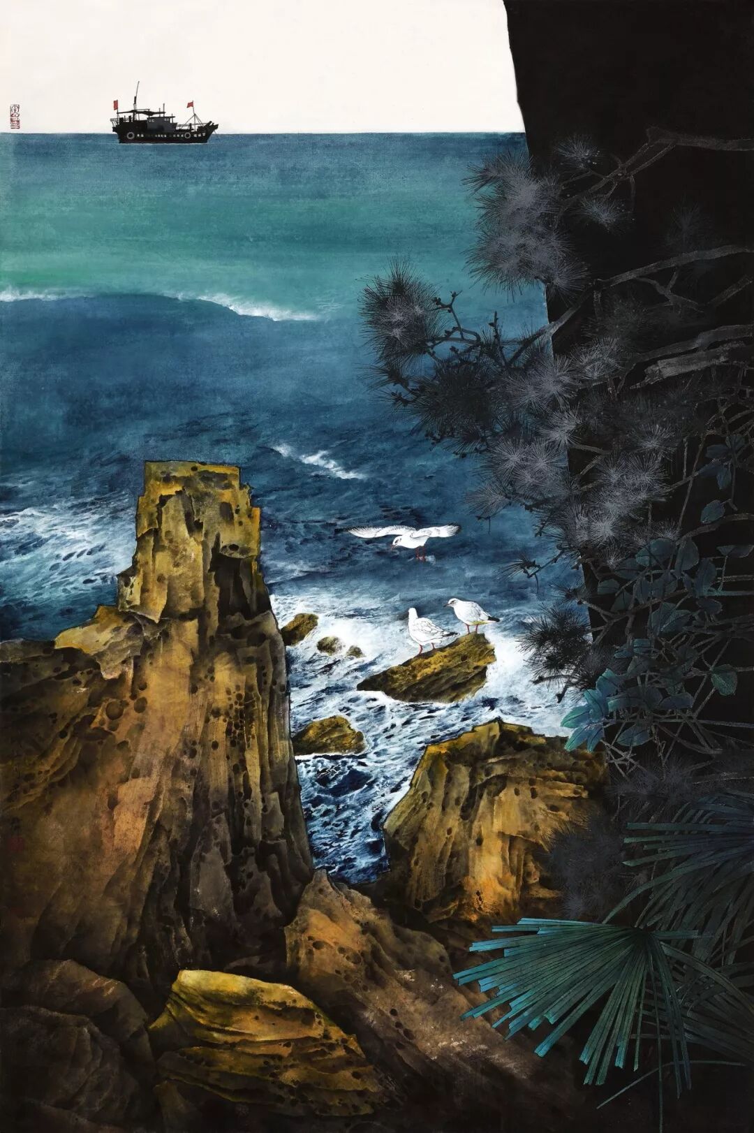 名家书画:未君 重彩山水画《驾着渔船听你歌唱》纸本设色155×103cm