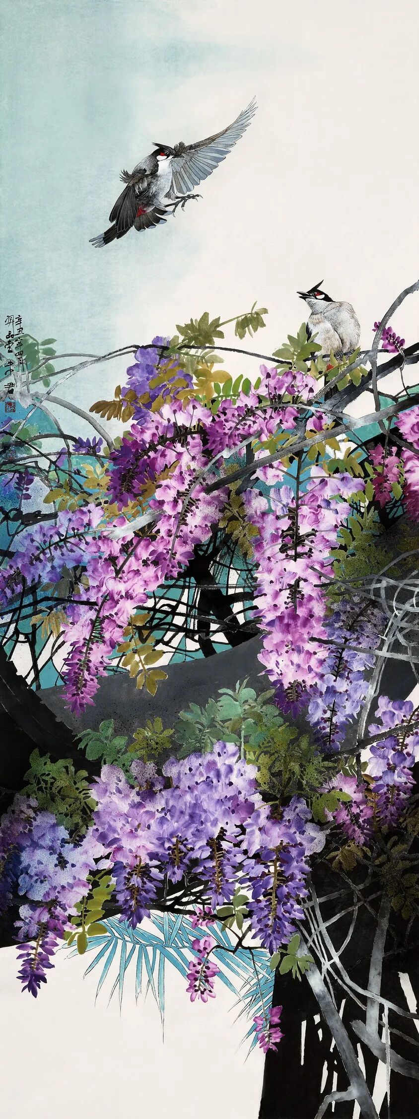 名家书画:未君 重彩花鸟画《红耳鹎的春天》13.8×70cm
