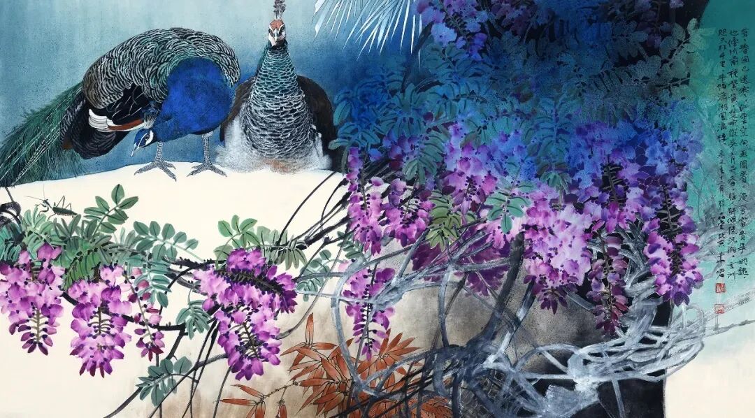 名家书画:未君 重彩花鸟画《风轻云暖》138x70cm