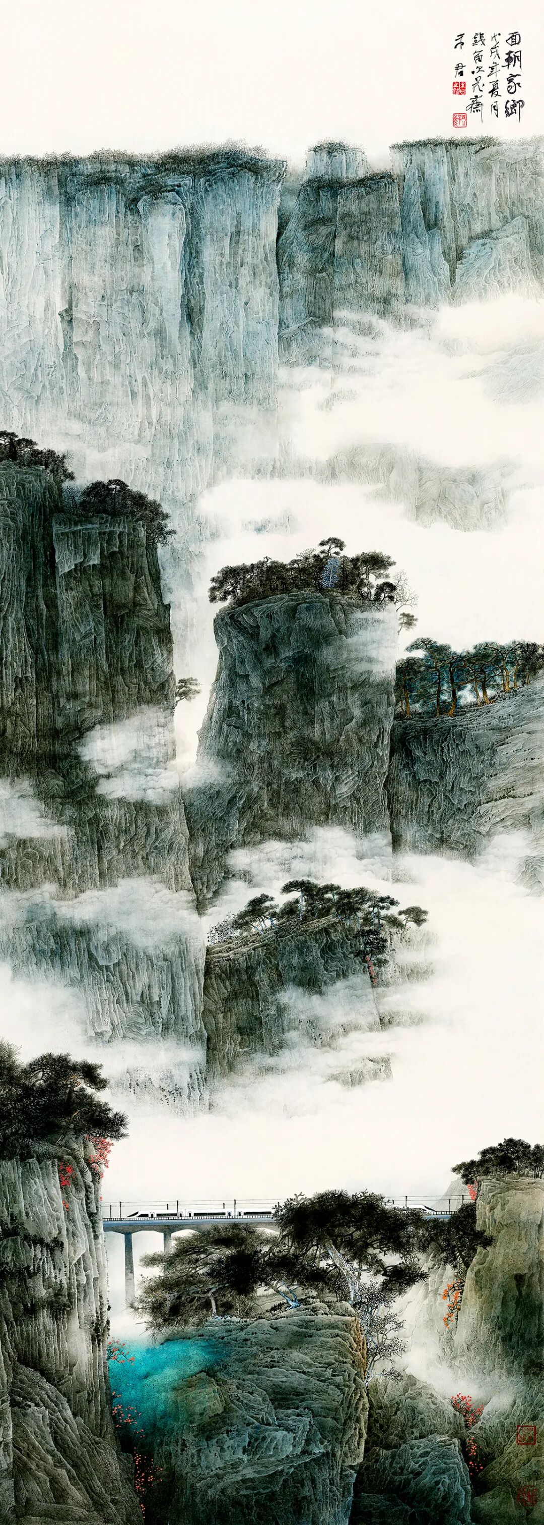 名家书画:未君 重彩山水画《潇湘图卷•面朝家乡》227×81.5cm
