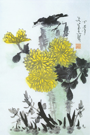 诸葛志润 花鸟画作品《八哥迎菊图》 45x68cm