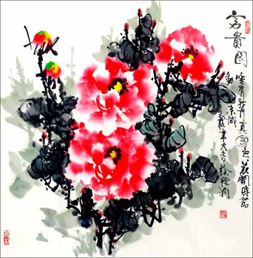 为迎接党的十八大召开应全国人大会议中心特别邀请创作绘制大型中国花鸟画作品四副、全部装裱上墙,其中作品《莺歌燕舞颂盛世》装挂在迎门大厅左侧、《国色赋》、《盛世艳荷》、《藤萝颂春》装挂在会议大厅走廊左侧,同时又绘制礼品画二十余幅。