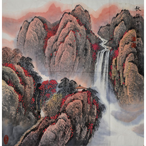 其绘画艺术,质朴而厚,方峻严整,不以小巧胜、而凭气势出,既有坚实、丰富、传统的功底,又吸收融合了西画美学艺术,形成自己独树一帜的艺术风格。作品兼具南北派画风特点:既恢弘雄壮、气势磅礴、苍润大方,又平淡天真、气象温润、苍茫素雅、禅意澄明。笔墨稳健而洒脱、色彩丰富兼厚重,用笔、用墨、用色、气象独特,意境深远而富含雅致诗意。