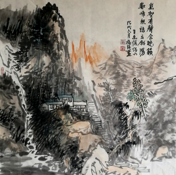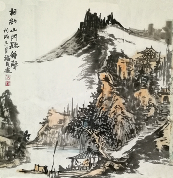 仙福民 山水画《相约山门听钟声》 68x68cm